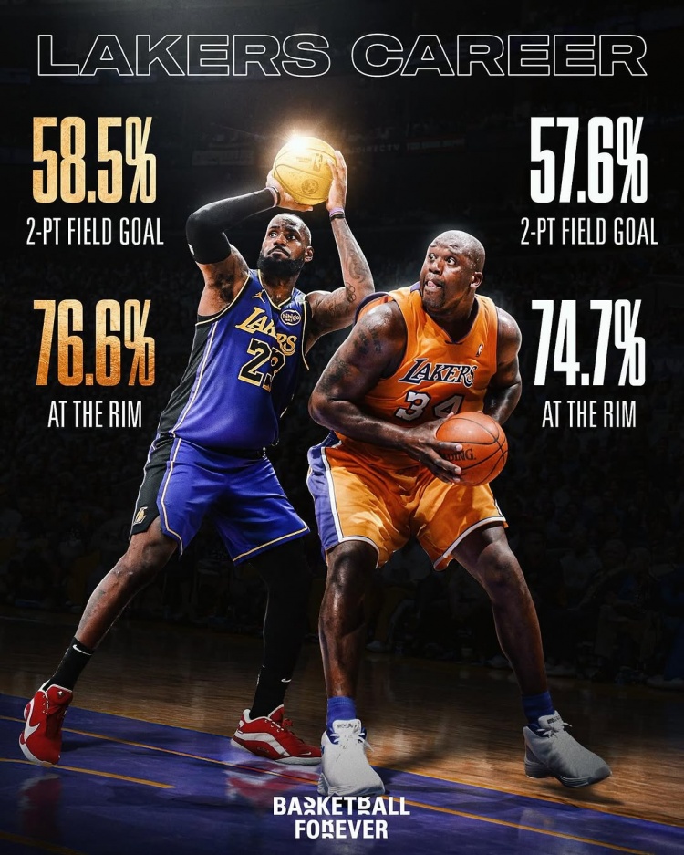 奧尼爾生涯在湖人,兩分命中率57.6%,籃下命中率74.7%