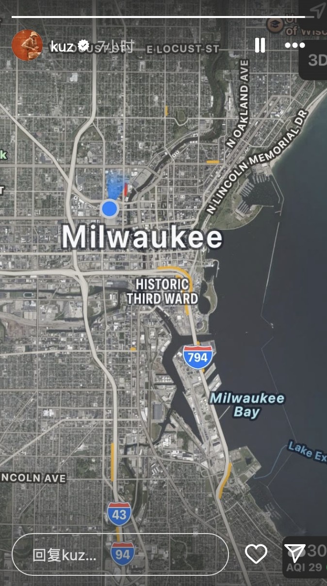今日,凱爾-庫茲馬更新ins,曬圖抵達密爾沃基。