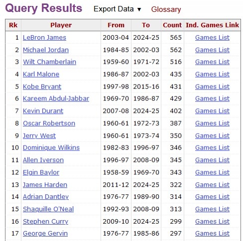 至此,庫裡職業(yè)生涯常規賽30+場(chǎng)次數達到300場(chǎng),成為NBA歷史第16個(gè)做到這一點(diǎn)的球員。榜單具體如下: