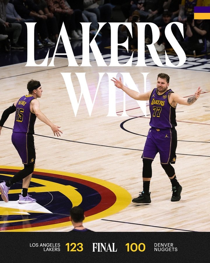 賽後,湖人官方曬出贏(yíng)球海報,東契奇和裡夫斯登上封面。