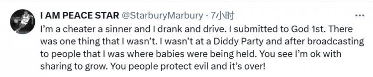 馬佈裡回復:“我是一個(gè)騙子、一個(gè)罪人,我酒後駕車(chē)。但我首先服從於上帝。但是有一件事我沒(méi)做,我沒(méi)在吹牛老爹的派對上,我沒(méi)有向人們廣播說(shuō)我曾在關(guān)押嬰兒的地方。你看,我同意通過(guò)分享來(lái)成長(cháng)。而你們這些人卻保護邪惡。結束這一切吧!”