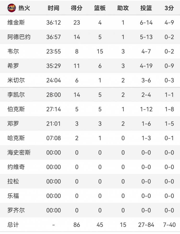 本場(chǎng)比賽,熱火全隊三分手感冰涼。全隊外線(xiàn)共計40中7,僅有維金斯和李凱爾手感在線(xiàn)(維金斯9中4、李凱爾1中1)。