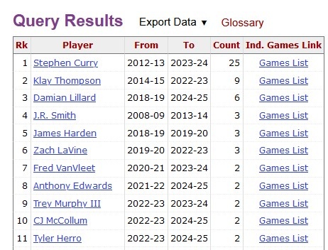 據統計,NBA歷史上投進(jìn)10+三分的場(chǎng)次數排行榜中,庫裡26次斷檔第一,第二的克萊9次。具體如下: