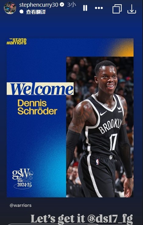 庫裡更新IG轉發(fā)施羅德加盟球隊海報,配文寫(xiě)道:“讓我們沖哇@施羅德?!?/p>