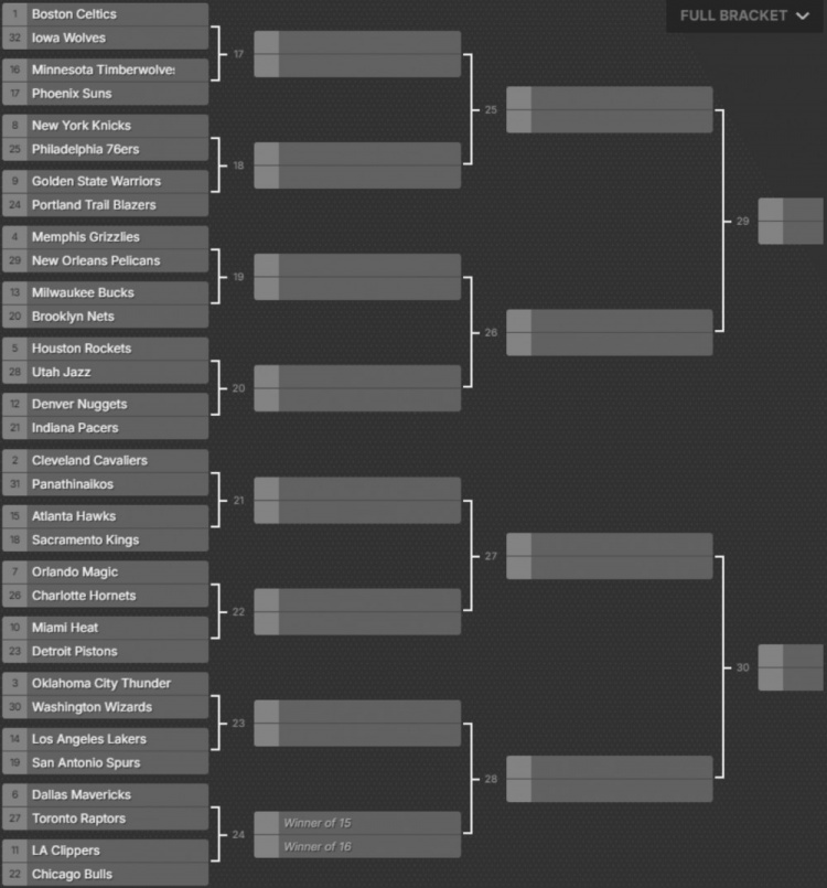 在新的賽制中,我們將取消小組賽階段,改為直接獲勝並晉級的賽制,這將不計入常規賽戰績(jì),因為目前NBA杯賽制的這一部分讓人感到困惑,普通球迷關(guān)註起來(lái)很麻煩。將其作為一項獨立的賽事也會(huì )讓NBA杯顯得更加重要,就像NCAA的瘋狂三月錦標賽一樣。根據這種賽制,截止日期前NBA戰績(jì)最好的球隊將在首輪對陣發(fā)展聯(lián)盟的參賽球隊,NBA戰績(jì)第二好的球隊將對陣歐洲聯(lián)賽衛冕冠軍(或CBA/NBL冠軍),NBA戰績(jì)第三的球隊將對陣戰績(jì)最差的球隊,NBA戰績(jì)第四的球隊將對陣戰績(jì)第二差的球隊,以此類(lèi)推。例如,按這種規則,今年的分組情況是這樣的: