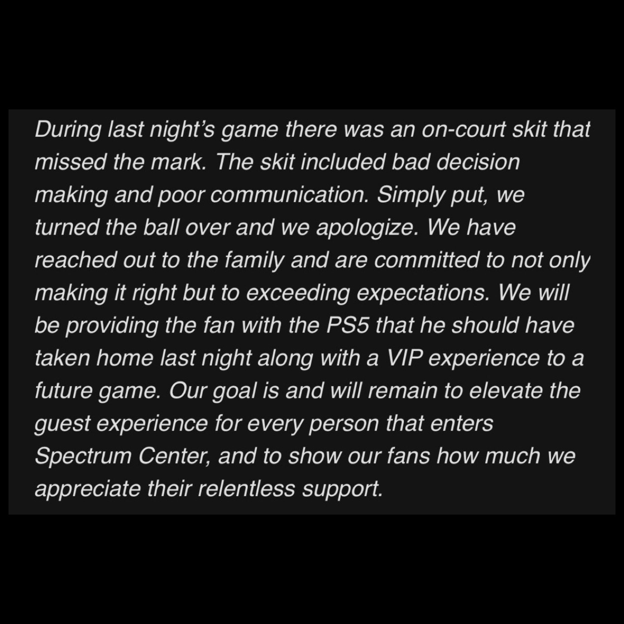 這件事情曝出之後引起瞭眾多球迷的憤怒,黃蜂隊迫於壓力也在今天公開(kāi)道歉,並表示將把小孩子本該擁有的PS5送給他,並且還送給小孩子一張未來(lái)的VIP觀(guān)賽門(mén)票。