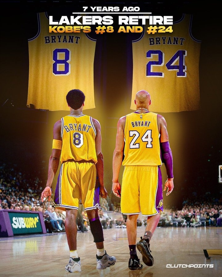 - 歷史唯一七年前的今天:湖人退役科比8號和24號球衣