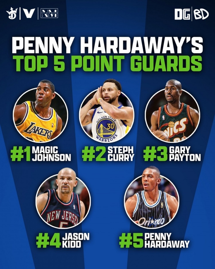 便士給出的排名是:1、魔術(shù)師 2、庫裡 3、加裡-佩頓 4、基德 5、自己