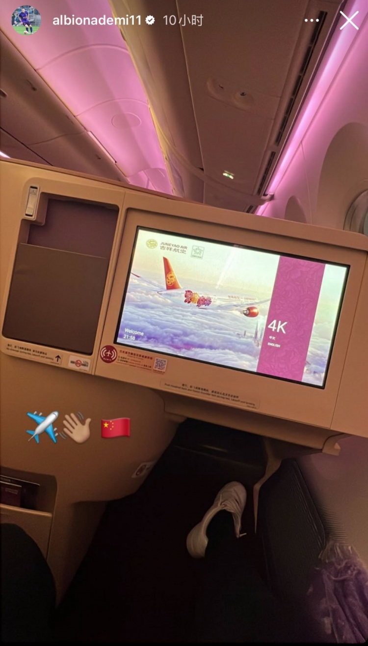 阿代米在社媒更新動(dòng)態(tài),曬出瞭他的登機照,並配上瞭飛往中國的表情。