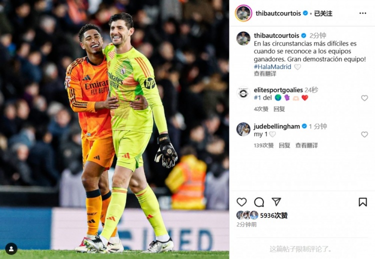 庫爾圖瓦曬出瞭與絕殺功臣貝林厄姆的合照,並配文:正是在最困難的情況下,獲勝團隊才會(huì )得到認可。優(yōu)秀的示范團隊!