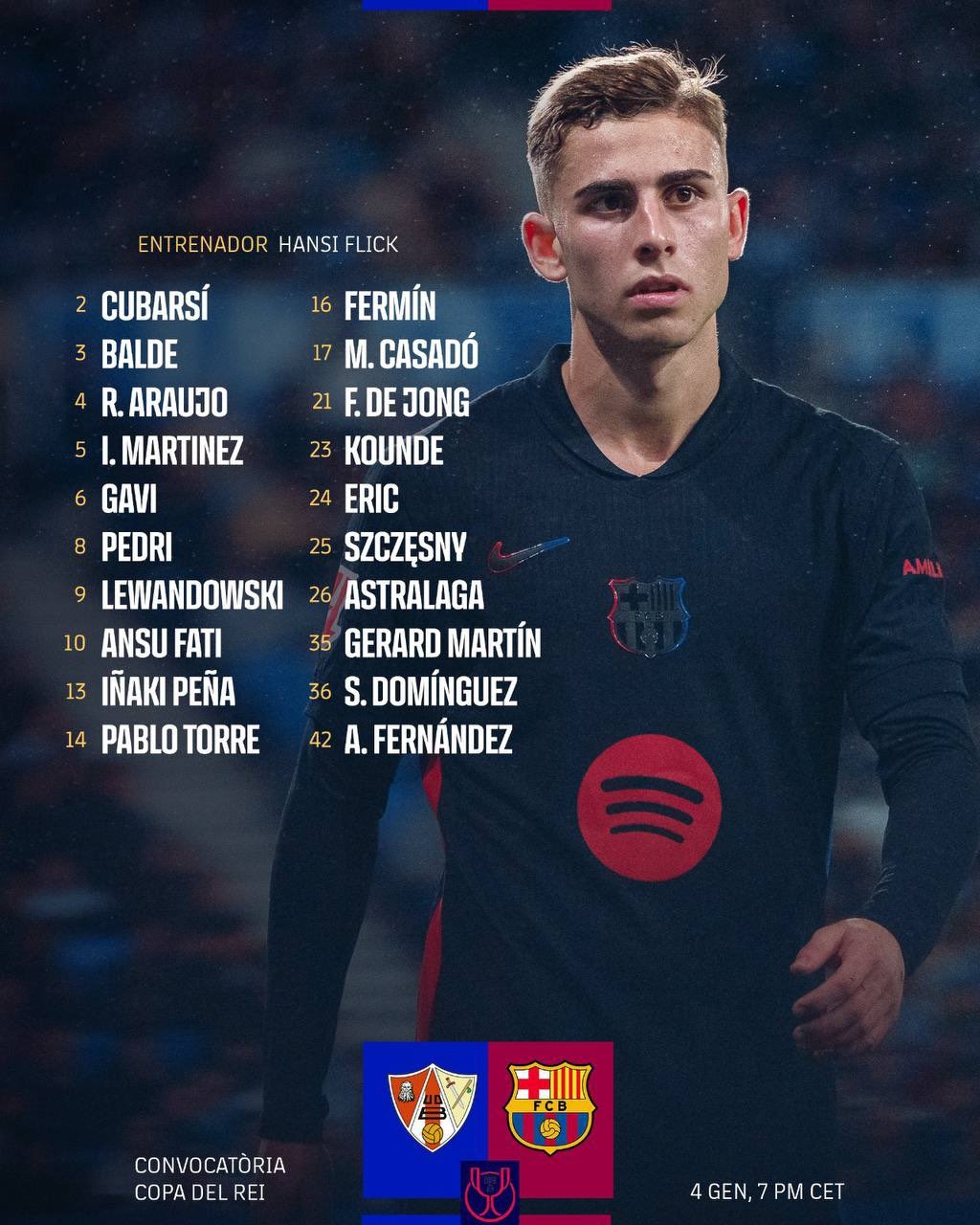 中場(chǎng):6-加維、8-佩德裡、14-托雷、16-費爾明、17-卡薩多、21-德容、42-A-費爾南德斯