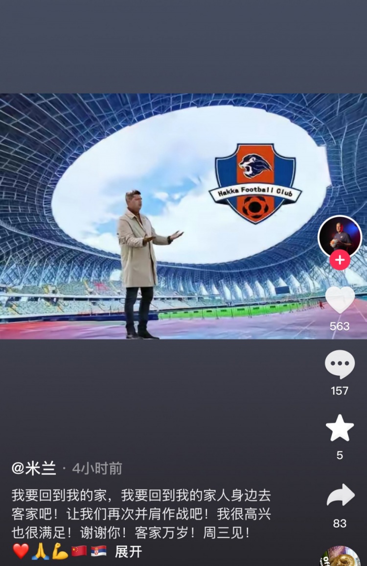 1月6日訊 今天,裡斯蒂奇更新社媒,透露自己將繼續執教梅州客傢。