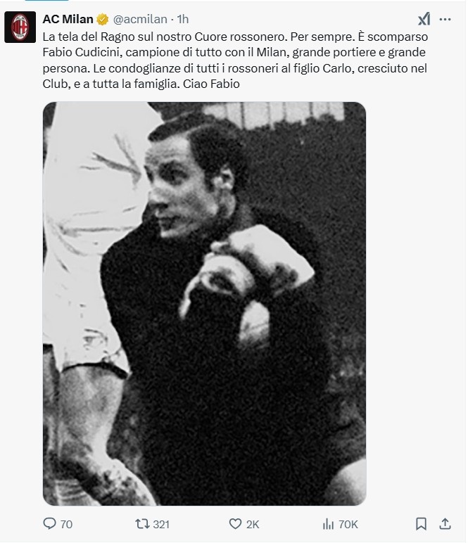 紅黑軍團心中永遠的蜘蛛網(wǎng),法比奧-庫迪奇尼。米蘭的冠軍,一位偉大的門(mén)將,一位偉大的人,去世瞭。