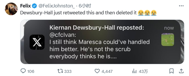 在社媒上,有球迷發(fā)文表示:我還是覺(jué)得馬雷斯卡可以更好地使用霍爾,他不像大傢想象的那樣差。