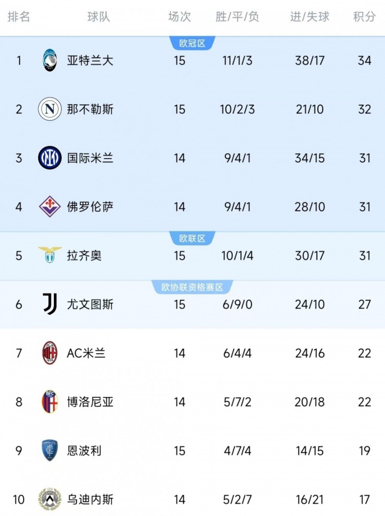據Opta統計,意甲前15輪比賽拿到34分,這是亞特蘭大隊史意甲同期最高積分。