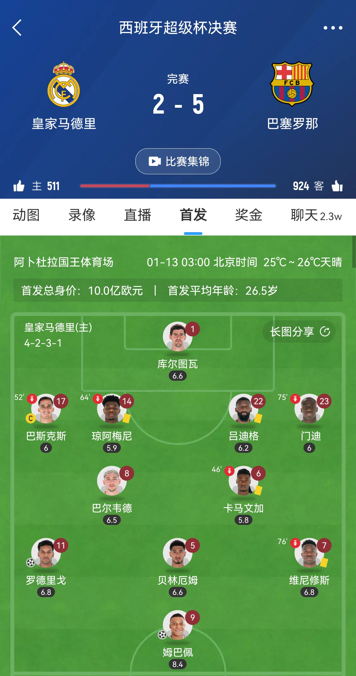 本場(chǎng)比賽皇馬同時(shí)首發(fā)姆巴佩、維尼修斯、貝林厄姆和羅德裡戈,巴爾韋德和卡馬文加搭檔雙後腰,實(shí)戰中球隊在攻防轉換中多次被成功打反擊。