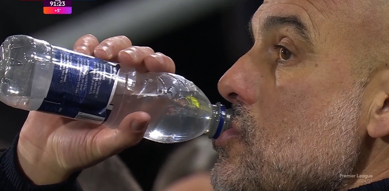補時(shí)第2分鐘,諾爾高力壓阿坎吉頭槌破門(mén),隨後鏡頭給到場(chǎng)邊的瓜迪奧拉,瓜迪奧拉喝瞭一瓶水。