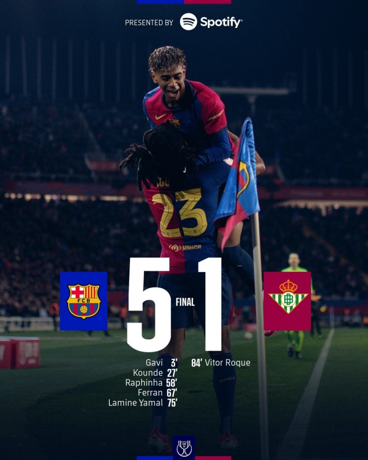 巴薩在國王杯5-1大勝貝蒂斯,巴薩多點(diǎn)開(kāi)花,亞馬爾收獲傳射。