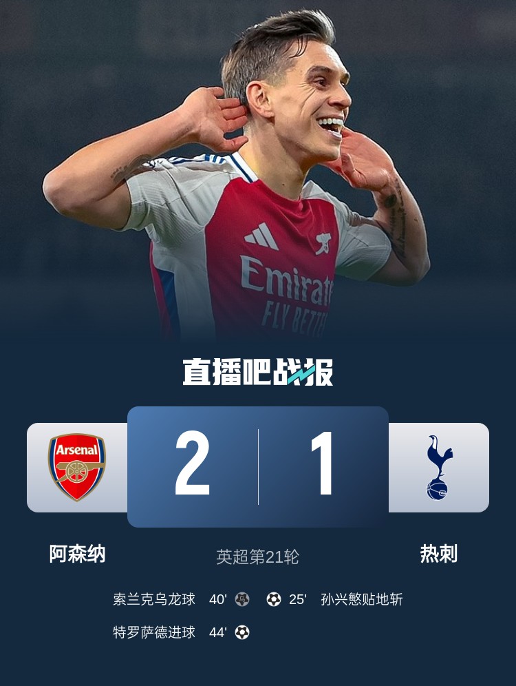 本輪英超焦點(diǎn)戰,阿森納2-1逆轉熱刺,索蘭克烏龍,特羅薩德、孫興慜破門(mén)。