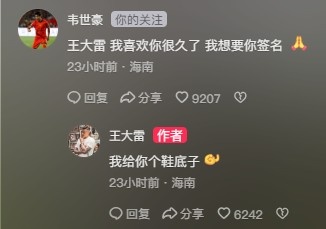 昨天一早,王大雷曾更新社媒,曬出瞭自己聘請的韓國私人訓練師。在這條社媒的評論區,韋世豪留言寫(xiě)道:“王大雷,我喜歡你很久瞭,我想要你簽名?!?/p>