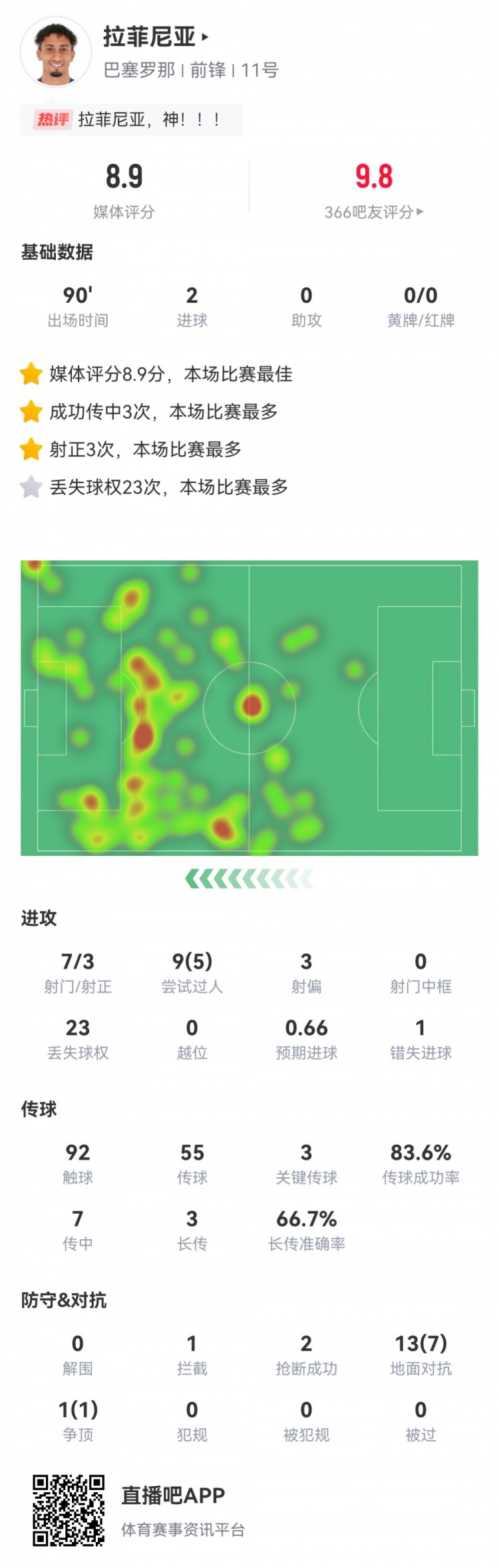 1月22日訊 本輪歐冠,巴薩5-4客場(chǎng)逆轉本菲卡。此役拉菲尼亞發(fā)揮出色,雙響建功+讀秒絕殺,球員全場(chǎng)重點(diǎn)數據如下↓
