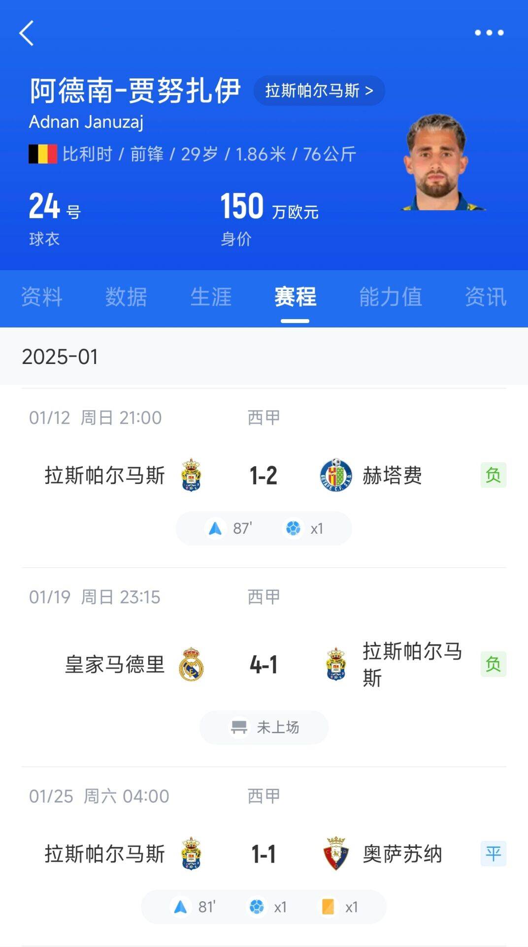 24年夏窗,賈努紮伊的老東傢塞維利亞將其租借至拉斯帕爾馬斯,目前29歲的賈努紮伊德轉身價(jià)僅為150萬(wàn)歐元,已經(jīng)低於自己18歲剛出道時(shí)的200萬(wàn)歐身價(jià)。