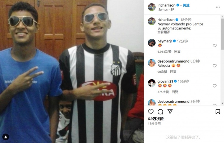 理查利森更新社媒曬出自己身穿桑托斯球衣的舊照,內馬爾本人則是在評論區留下瞭一個(gè)笑哭的表情。