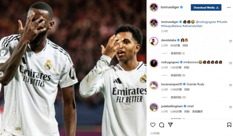 1月30日訊 在本輪歐冠,皇馬3-0客勝佈雷斯特,羅德裡戈完成雙響。賽後,呂迪格在社媒曬出和羅德裡戈一起單手遮臉的慶祝手勢+並配上表情: