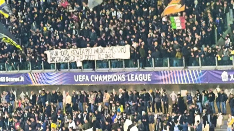 “達尼洛,你是我們的一員?!痹谟任膱D斯主場(chǎng)的南看臺上,斑馬軍團球迷齊聲高唱。同時(shí),兩條橫幅在看臺的內環(huán)和外環(huán)之間徐徐展開(kāi),寫(xiě)著(zhù)“尤文圖斯屬於球迷,感謝你做的一切,達尼洛”“在這價(jià)值觀(guān)缺失的世界,我們以最高的敬意送別隊長(cháng)達尼洛?!弊謽?。