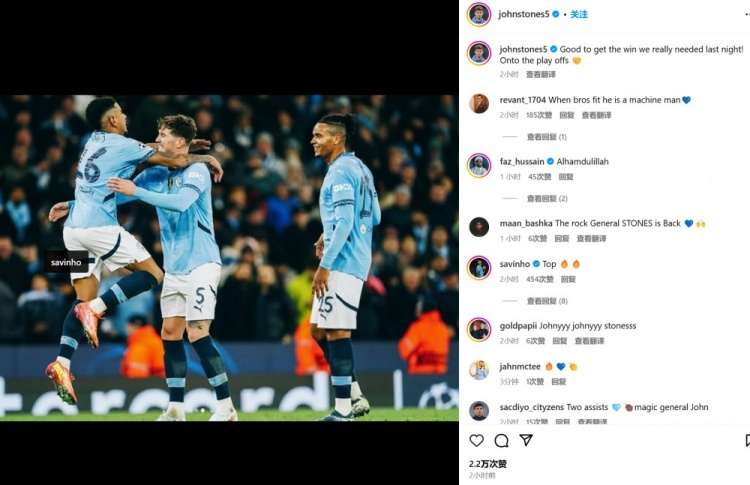 1月30日訊 曼城在本輪歐冠3-1逆轉佈魯日,成功晉級附加賽,送出2次助攻的斯通斯也通過(guò)社媒紀念勝利。