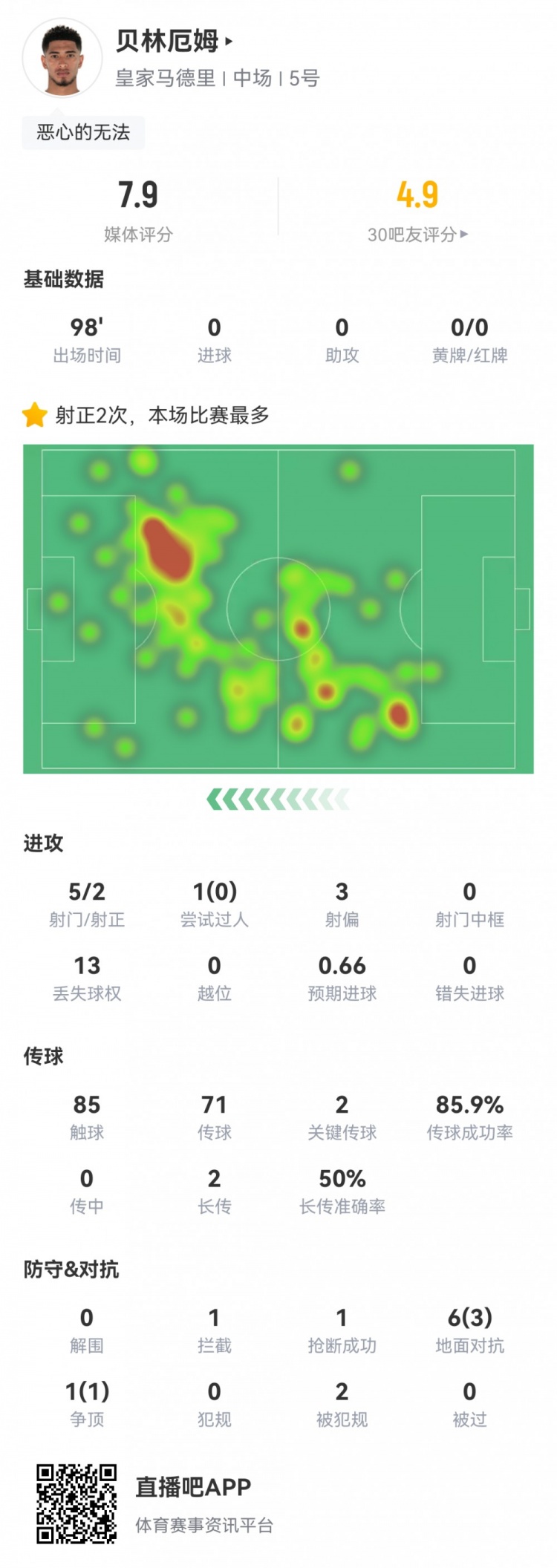 2月2日訊 本輪西甲,皇馬0-1客負西班牙人。此役貝林厄姆首發(fā)打滿(mǎn)全場(chǎng),球員全場(chǎng)重點(diǎn)數據如下↓