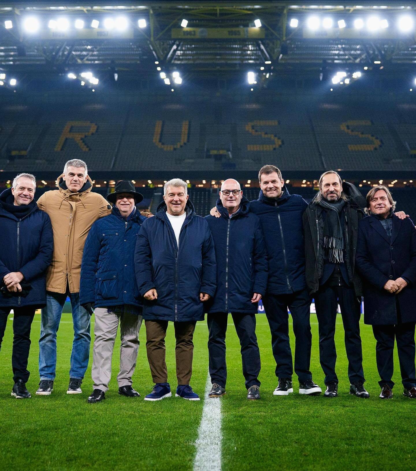 賽前,按照傳統慣例,巴薩主席拉波爾塔和多特高層在伊杜納信號公園球場(chǎng)合影留念。