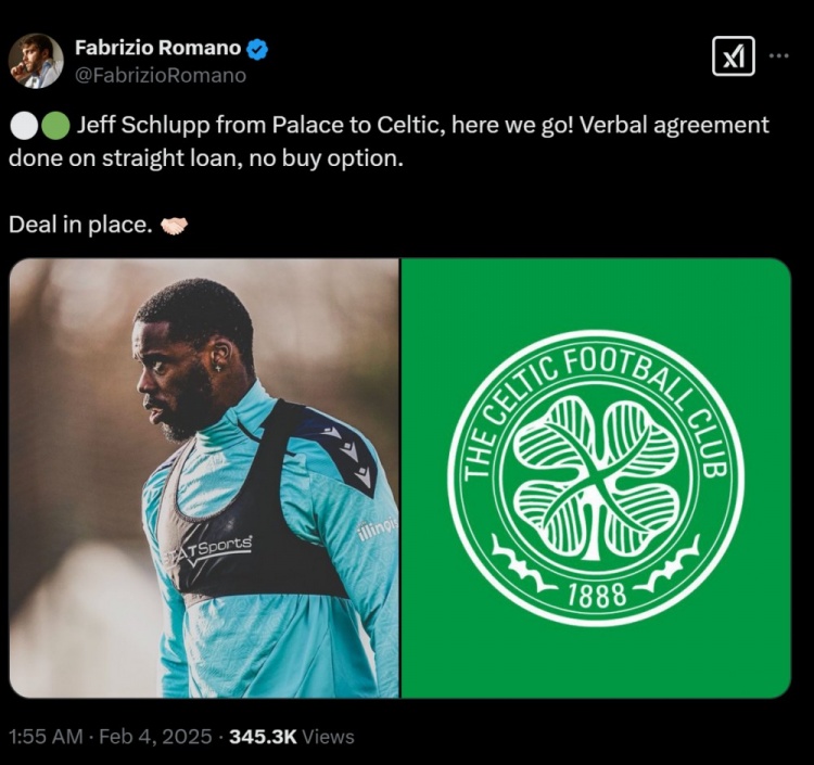 2月4日訊 名記羅馬諾用標志性的here we go確認,水晶宮中場(chǎng)施魯普將以租借形式加盟凱爾特人。