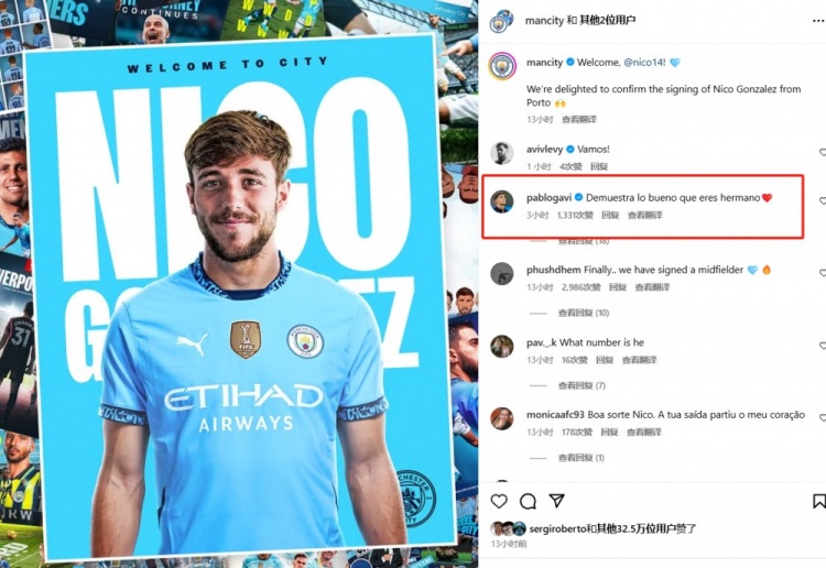 在尼科-岡薩雷斯和曼城官方的官宣動(dòng)態(tài)下,巴薩中場(chǎng)加維進(jìn)行瞭評論,向前隊友送上瞭祝福。