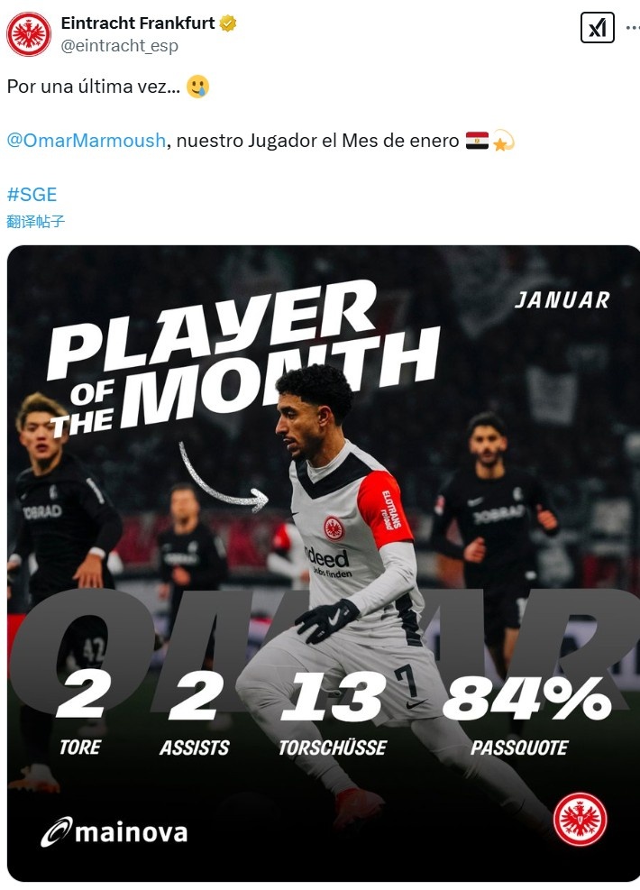 除特別注明外,本站所有內容均為24直播網(wǎng)整理排版,轉載請注明出處:2球2助,法蘭克福官方:馬爾穆什當選隊內1月最佳球員