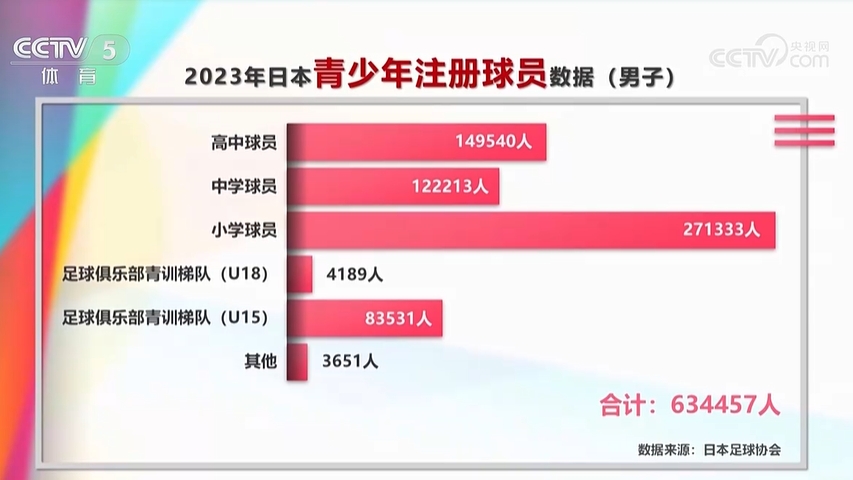 其中列出一組數據,2023年日本青少年註冊球員(男子)合計634457人,其中小學(xué)球員超27萬(wàn)人,俱樂(lè )部U15青訓梯隊超8萬(wàn)人
