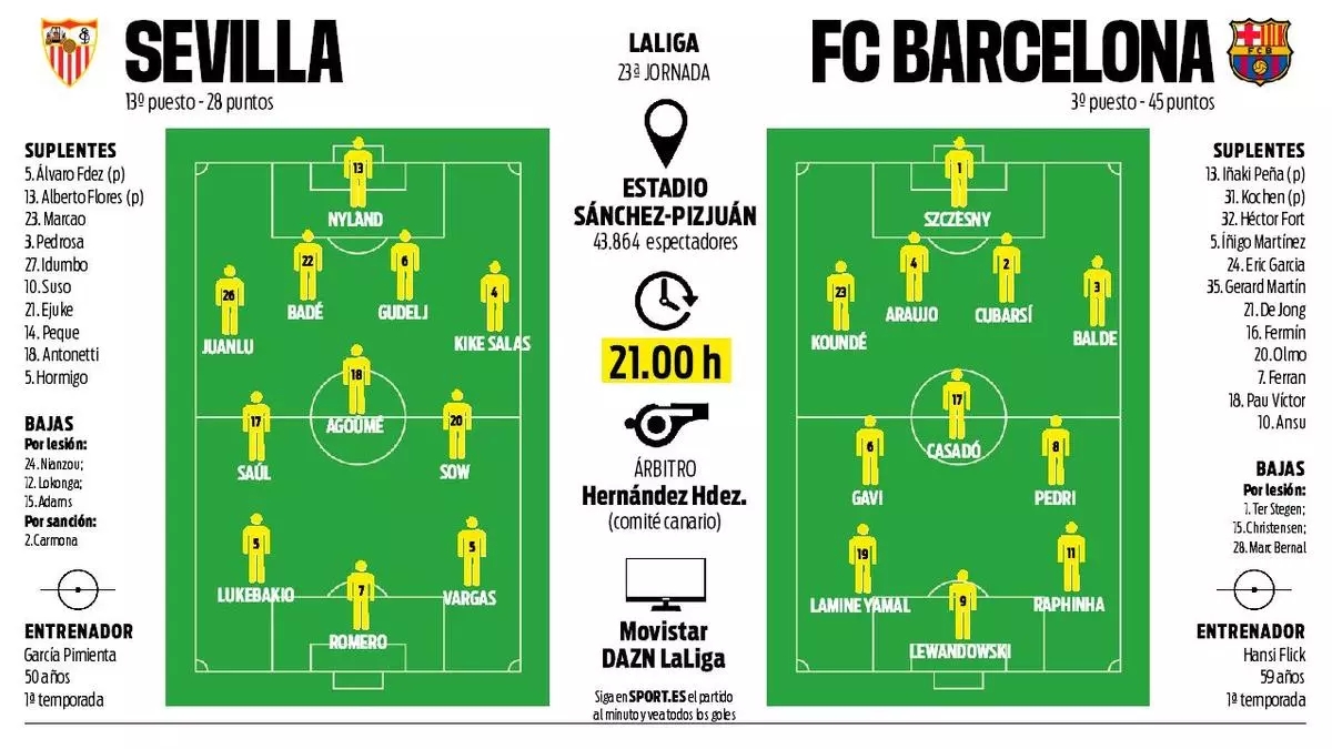 2月9日訊 據西班牙《每日體育報》報道,巴薩將在本輪西甲聯(lián)賽中客場(chǎng)挑戰塞維利亞,萊萬(wàn)多夫斯基和加維將回到首發(fā)陣容中。