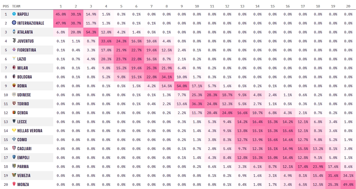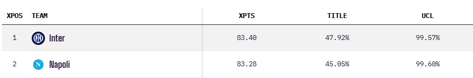 機構演算數據顯示,國米本賽季意甲奪冠概率為47.9%,比目前排名榜首的那不勒斯高出近3個(gè)百分點(diǎn),那不勒斯奪冠概率為45%,機構預測兩隊季末都是83個(gè)積分收官。