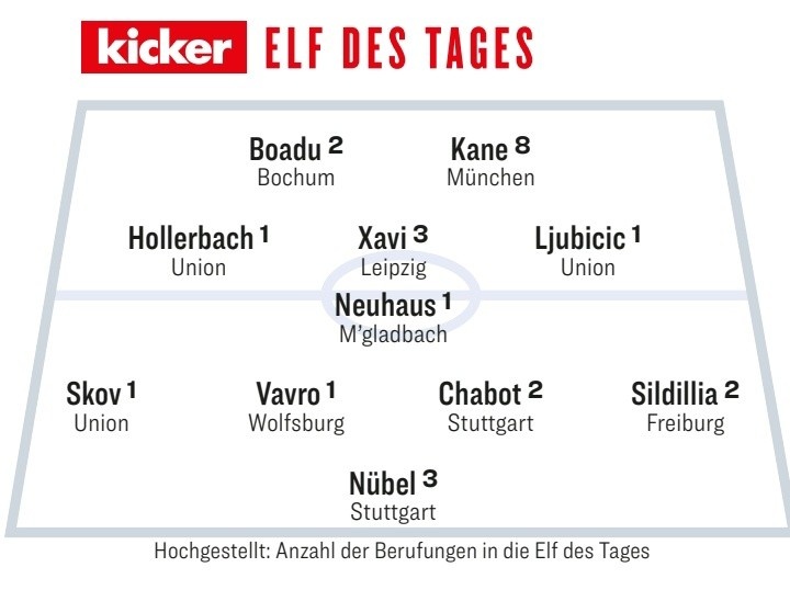 2月10日訊 德甲第21輪已經(jīng)完賽,《踢球者》評出瞭本輪德甲最佳陣容,凱恩領(lǐng)銜。