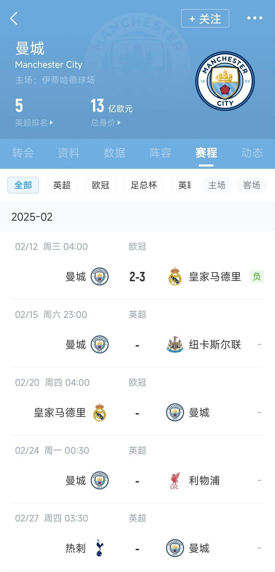02月12日訊 曼城在歐冠附加賽的首回合2-3不敵皇馬,藍月亮的魔鬼賽程首戰告負。