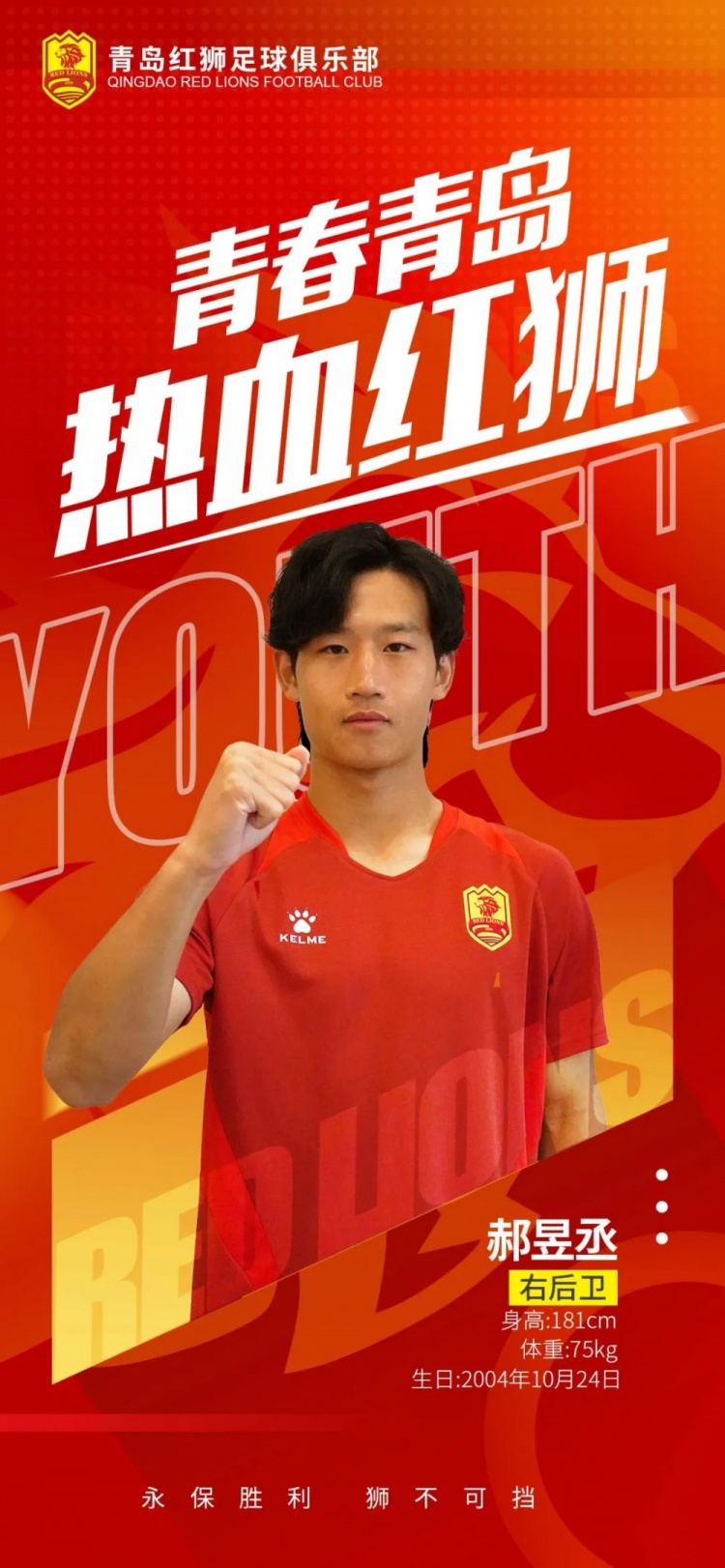 郝昱丞,北京人,出生於2004年10月24日,身高181cm,體重75kg,邊路多面手。2018年進(jìn)入北京國安梯隊,2022年代表北京國安參加中國足協(xié)U21聯(lián)賽獲得冠軍,2024年入選北京國安一線(xiàn)隊。