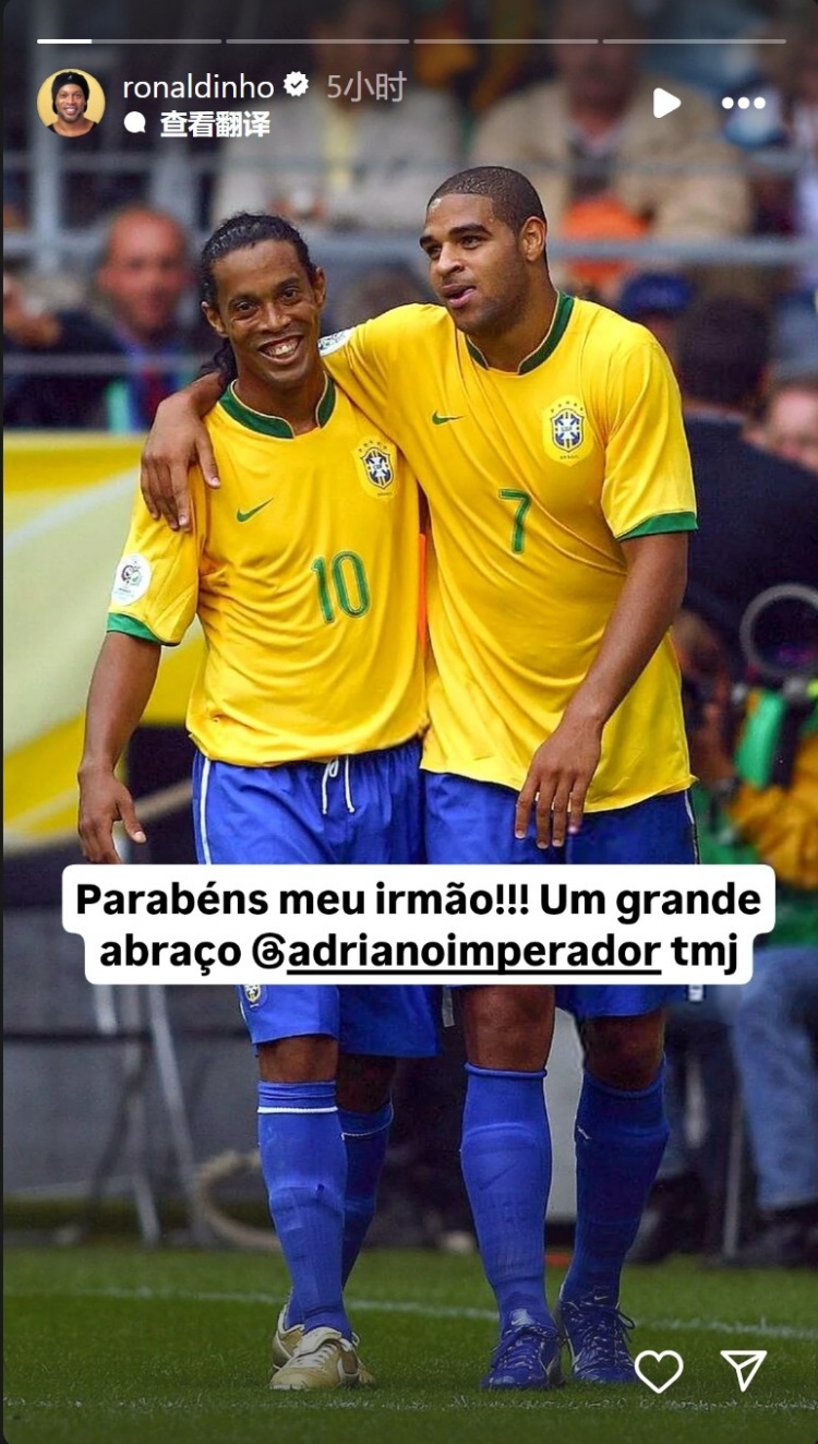 阿德裡亞諾迎來(lái)43歲生日,小羅社媒曬出與他昔日在國傢隊的合照,並配文:“祝你生日快樂(lè )我的兄弟!給你大大的擁抱!”