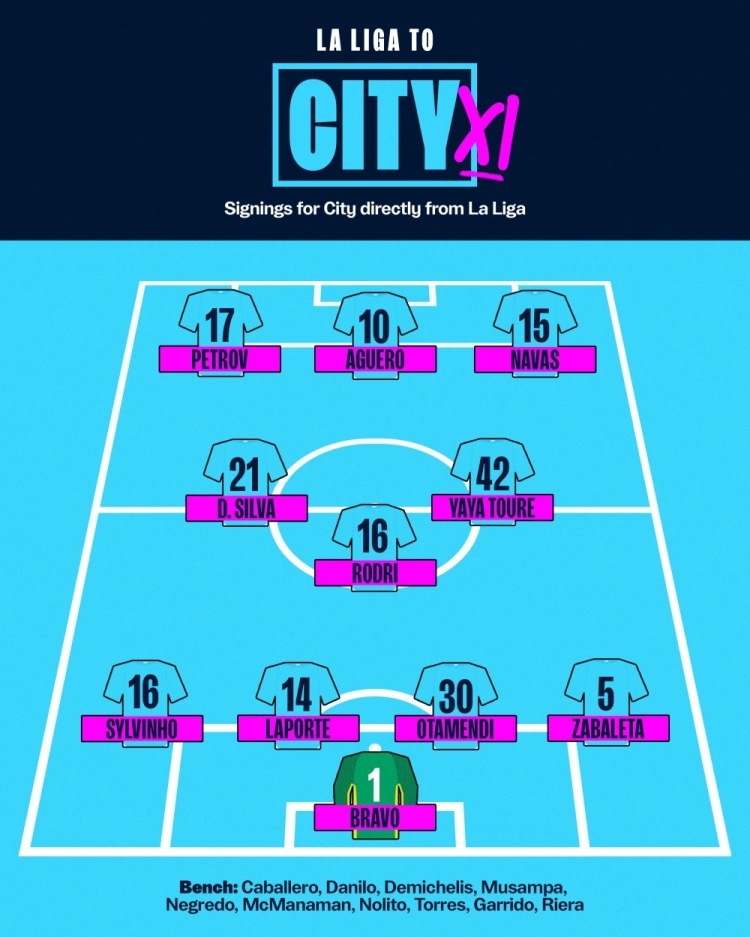 2月18日訊 曼城官方列出瞭俱樂(lè )部從西甲引進(jìn)球員的最佳陣容。其中,羅德裡、阿圭羅、大衛-席爾瓦、亞亞-圖雷等人入選。