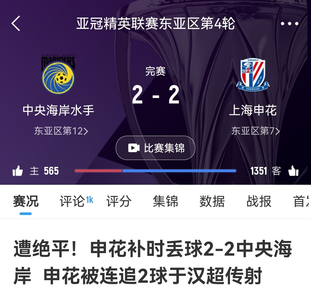 在對陣倒數第一中央海岸水手時(shí),申花在比賽最後時(shí)刻被對手絕平,送給中央海岸水手本屆亞冠首個(gè)積分,也是唯一的積分↓