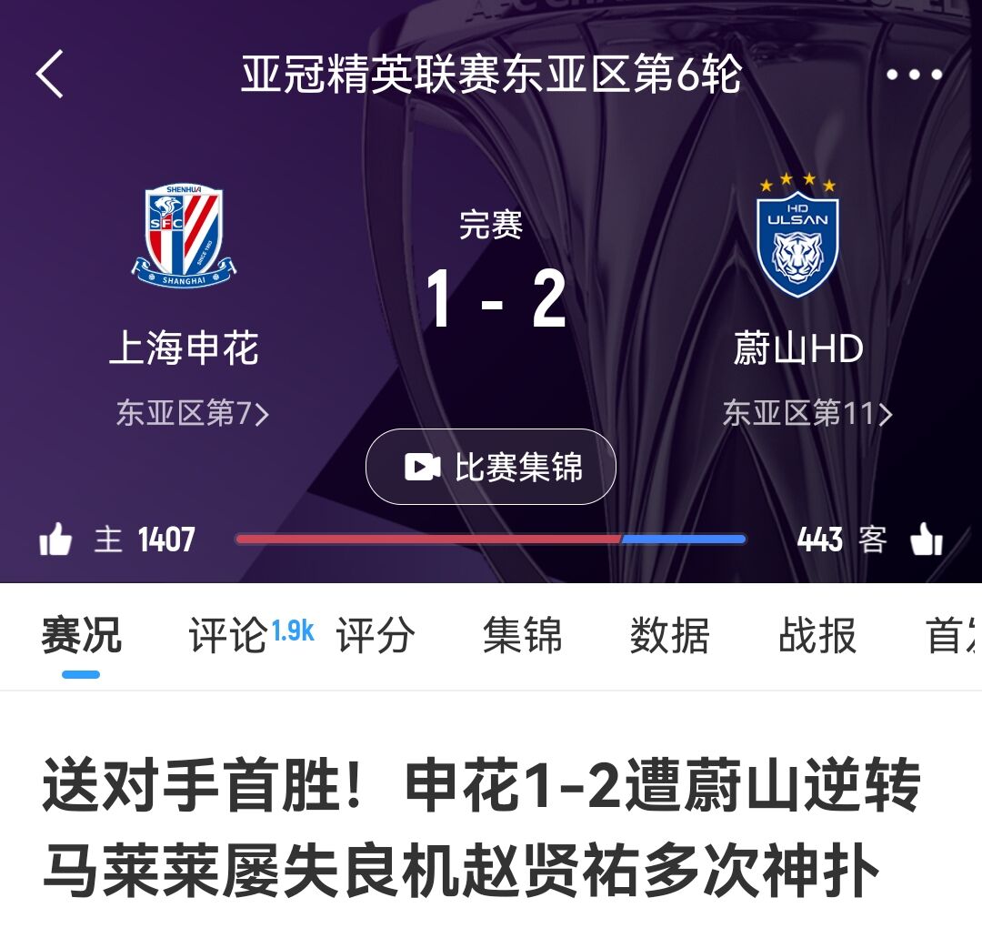 而在對陣倒數第二蔚山HD時(shí),申花則是主場(chǎng)不敵對手,送給對手本屆亞冠的首勝,也是首個(gè)積分↓
