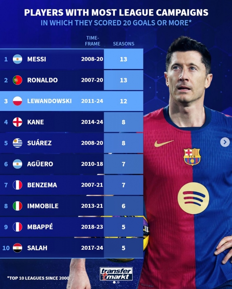 除特別注明外,本站所有內容均為24直播網(wǎng)整理排版,轉載請注明出處:德轉列新世紀聯(lián)賽單賽季進(jìn)球20+次數:梅西&C羅13次,萊萬(wàn)12次