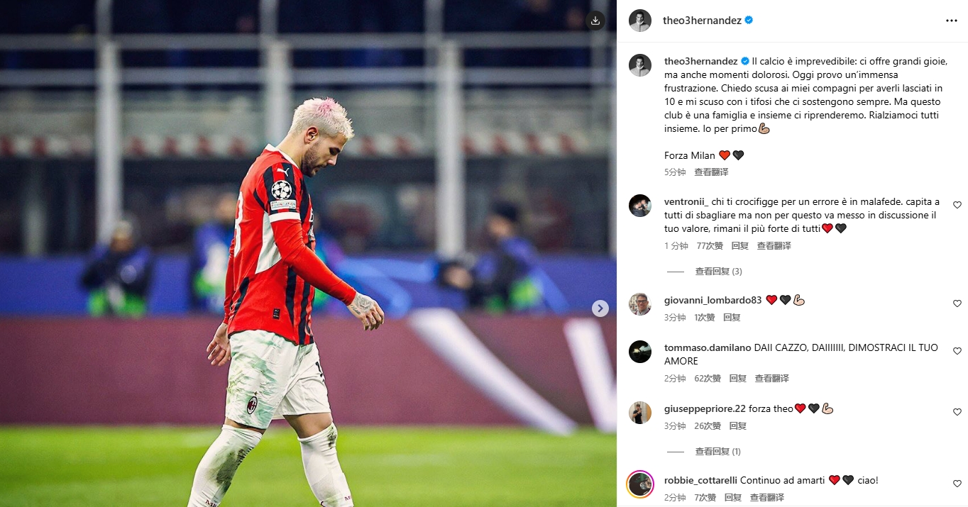 02月20日訊 歐冠附加賽次回合,特奧假摔染紅,米蘭遭費耶諾德淘汰。特奧發(fā)文致歉。