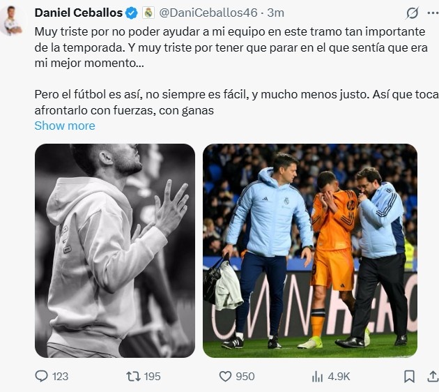 2月27日訊 皇馬官方宣佈塞巴略斯左腿半膜肌受傷&肌腱受損,多傢媒體表示他預計傷停2個(gè)月時(shí)間。塞巴略斯更新瞭社媒。