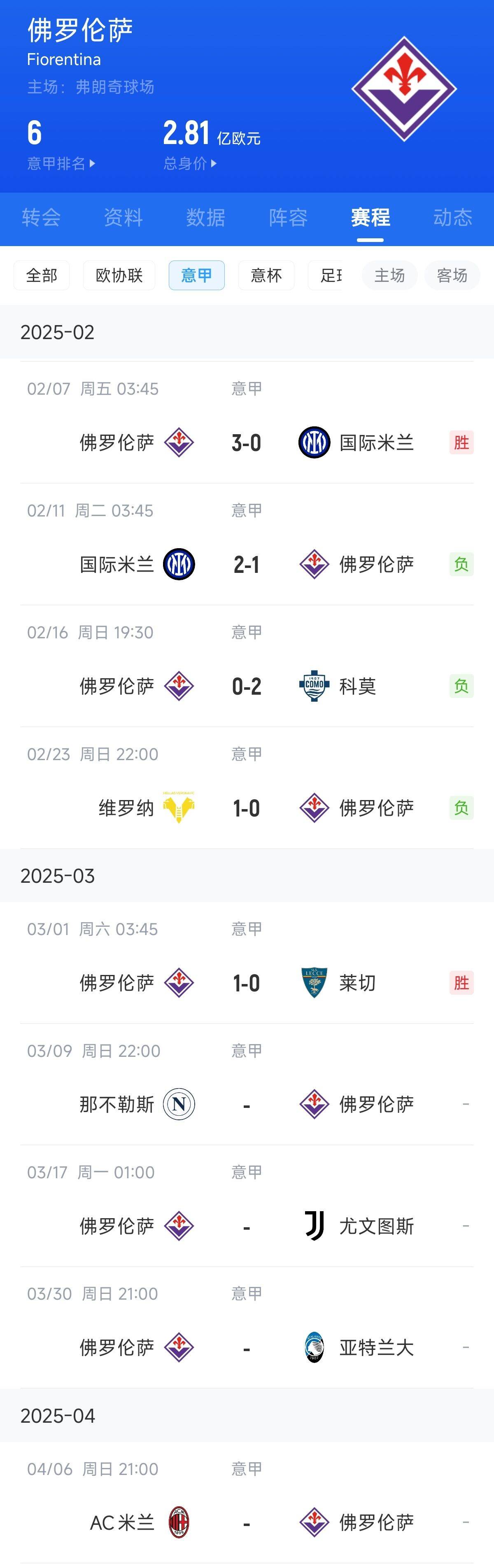 未來(lái)3輪佛羅倫薩將連續對陣意甲前4名中的那不勒斯(第2)、尤文圖斯(第4)和亞特蘭大(第3)。