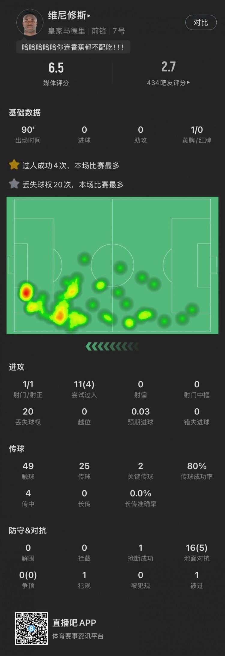 維尼修斯本場(chǎng)主要數據↓